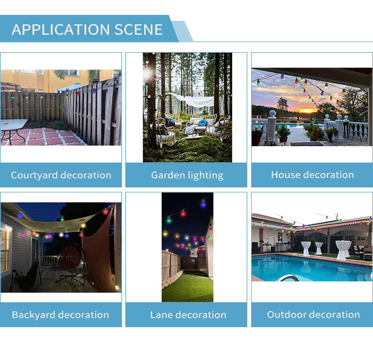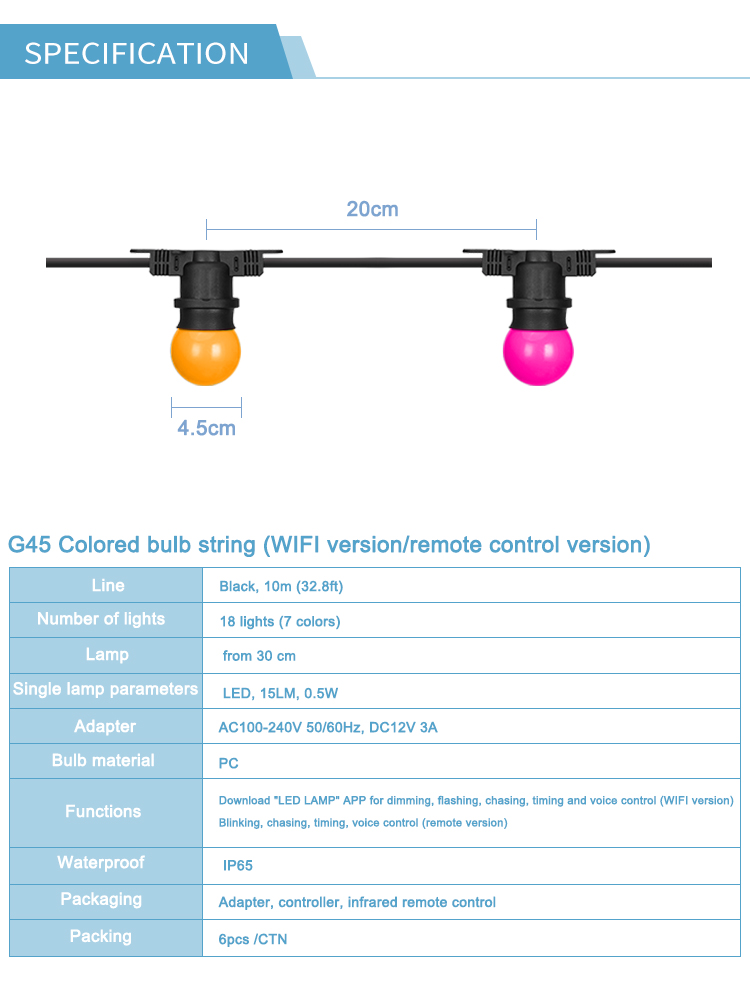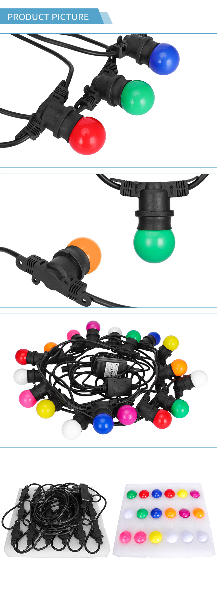 Introduction: 1) Line: 10m(32.8ft) 2) Adapter: AC120-240V 3) Number of lights: 18 lights 4) Distance of lamp: 30cm 5) Light bulb material: PET 6) Series: Max is connected with 40 sets 7) Both indoor and outdoor waterproof