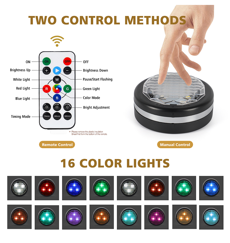 11: Package: color box + 6pcs lamp in outer box + 2pcs remote controller + 1pcs manual + 8pcs double-sided adhesive tape